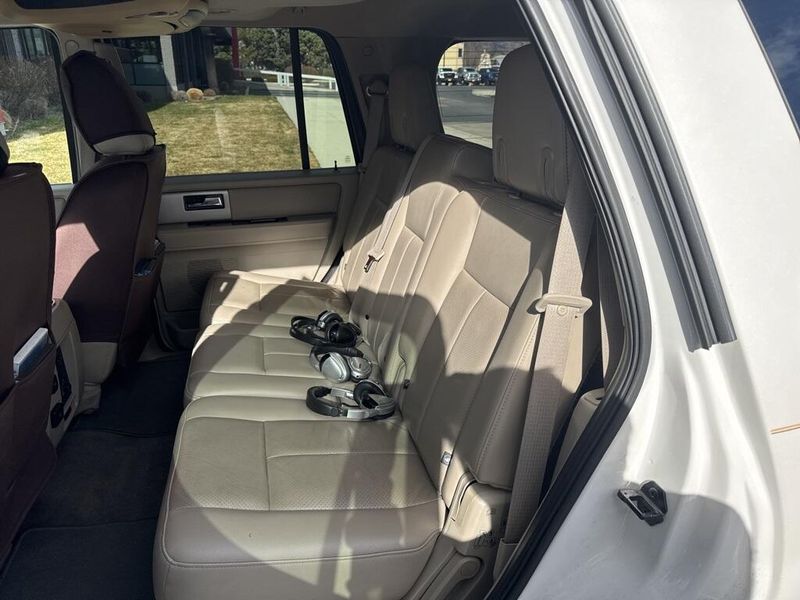 18'' Machined-Aluminum Wheels, 3.31 Axle Ratio, 3rd row seats: split-bench, 4-Wheel Disc Brakes, 7 Speakers, ABS brakes, Adjustable pedals, Air Conditioning, Alloy wheels, AM/FM radio: SiriusXM, Auto-dimming door mirrors, Auto-dimming Rear-View mirror, Automatic temperature control, Brake assist, Bumpers: body-color, CD player, Compass, Delay-off headlights, Driver door bin, Driver vanity mirror, Dual front impact airbags, Dual front side impact airbags, Electronic Stability Control, Exterior Parking Camera Rear, Four wheel independent suspension, Front anti-roll bar, Front Bucket Seats, Front Center Armrest, Front dual zone A/C, Front fog lights, Front reading lights, Fully automatic headlights, Garage door transmitter, GVWR: 7,300 lbs Payload Package, Heated & Cooled Perforated Leather Fr Bucket Seats, Heated door mirrors, Heated front seats, Heated rear seats, Illuminated entry, Leather Shift Knob, Leather steering wheel, Low tire pressure warning, Memory seat, Occupant sensing airbag, Outside temperature display, Overhead airbag, Overhead console, Panic alarm, Passenger door bin, Passenger vanity mirror, Pedal memory, Power door mirrors, Power driver seat, Power Liftgate, Power passenger seat, Power steering, Power windows, Radio data system, Radio: Premium Sound System w/Single-CD/MP3 Player, Rain sensing wipers, Rear air conditioning, Rear anti-roll bar, Rear audio controls, Rear reading lights, Rear window defroster, Rear window wiper, Remote keyless entry, Roof rack, Security system, SiriusXM Satellite Radio, Speed control, Speed-sensing steering, Speed-Sensitive Wipers, Split folding rear seat, Steering wheel mounted audio controls, Subwoofer, SYNC, Tachometer, Tilt steering wheel, Traction control, Trip computer, Turn signal indicator mirrors, Variably intermittent wipers, Ventilated front seats, Voltmeter.