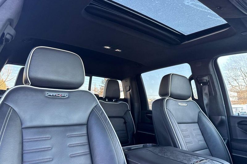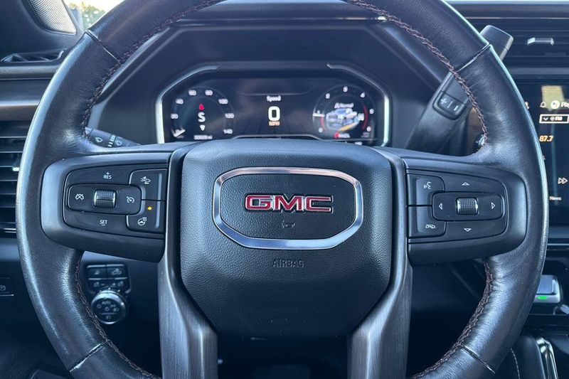 10-Speed Automatic, 4WD, Obsidian Rush Leather, 12 Speakers, 120-Volt Bed Mounted Power Outlet, 120-Volt Instrument Panel Power Outlet, 16-Way Power Driver Seat Adjuster w/Lumbar, 16-Way Power Passenger Seat Adjuster w/Lumbar, 2 Charge-Only Rear USB Ports, 2 Charge/Data USB Ports Inside Center Console, 2 USB Ports, 2-Speed Active Transfer Case, 220-Amp Alternator, 4-Wheel Disc Brakes, 5th Wheel & Gooseneck Trailer Wiring Provisions, ABS brakes, Air Conditioning, Alloy wheels, AM/FM radio: SiriusXM with 360L, Apple CarPlay/Android Auto, Auto High-beam Headlights, Auto-dimming door mirrors, Auto-dimming Rear-View mirror, Automatic Emergency Braking, Automatic temperature control, Bed View Camera w/2 Trailer Camera Provisions, Bose Premium Series 12-Speaker System, Brake assist, Buckle to Drive, Compass, Deep-Tinted Glass, Delay-off headlights, Driver door bin, Driver Memory, Driver vanity mirror, Dual front impact airbags, Dual front side impact airbags, Electric Rear-Window Defogger, Electronic Stability Control, Emergency communication system: OnStar, Engine Block Heater, Exhaust Brake, Floor-Mounted Center Console, Following Distance Indicator, Forward Collision Alert, Front anti-roll bar, Front Bucket Seats, Front Center Armrest, Front dual zone A/C, Front fog lights, Front License Plate Kit, Front Pedestrian Braking, Front Prem Floor Liners w/Removable Carpet Insert, Front Rain-Sensing Wipers, Front reading lights, Front wheel independent suspension, Full Grain Leather Seat Trim, Fully automatic headlights, Garage door transmitter, Gloss Black Door Handles, Gloss Black Header Grille & Grille Insert Bars, HD Surround Vision, Heads-Up Display, Heated 2nd Row Outboard Seats, Heated door mirrors, Heated Driver & Front Outboard Passenger Seats, Heated front seats, Heated rear seats, Heated steering wheel, Heavy-Duty 80 Amp Battery, Hill Descent Control, Hitch Guidance w/Hitch View, Illuminated entry, In-Vehicle Trailering System App, Inside Rearview Auto-Dimming Rear Camera Mirror, IntelliBeam Automatic High Beam On/Off, Keyless Open & Start, Lane Departure Warning System, Leather steering wheel, LED Cargo Area Lighting, LED Smoked Amber Roof Marker Lamps, Low tire pressure warning, Manual Tilt-Wheel/Telescoping Steering Column, Memory seat, Multicolor 15'' Diagonal Head-Up Display, Occupant sensing airbag, Off-Road Suspension, OnStar Services Capable, Outside temperature display, Overhead airbag, Overhead console, Panic alarm, Passenger door bin, Passenger vanity mirror, Pickup Box, Power door mirrors, Power driver seat, Power Front Passenger Windows w/Express Up/Down, Power moonroof, Power passenger seat, Power Sliding Rear Window w/Defogger, Power steering, Power Sunroof, Power windows, Preferred Equipment Group 4SG, Push Button Start, Radio: AM/FM w/Premium GMC Infotainment System, Rain sensing wipers, Rear Cross Traffic Alert, Rear Prem Floor Liners w/Removable Carpet Insert, Rear reading lights, Rear seat center armrest, Rear step bumper, Rear Wheelhouse Liners, Rear window defroster, Remote keyless entry, Remote Vehicle Starter System, Safety Alert Seat, Security system, SiriusXM w/360L Trial Subscription, Speed control, Speed-sensing steering, Split folding rear seat, Spray-On Pickup Bedliner w/GMC Logo, Steering Wheel Audio Controls, Steering wheel mounted audio controls, Tachometer, Telescoping steering wheel, Tilt steering wheel, Traction control, Trailer Cam Provisio